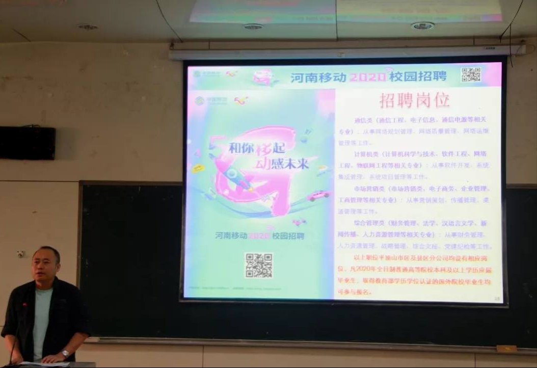 移动公司代表向大家介绍了自己公司主要负责和擅长的领域、目前业界地位等,使得广大毕业生对该公司产生了浓厚的兴趣。公司代表面向广大信工学子提出了岗位要求,并向广大毕业生承诺了薪资待遇和工作福利。同时,公司代表表明,同学们在学习和工作中要踏踏实实,打好基础,切勿眼高手低,敷衍了事,应该以积极向上的心态迎接即将到来的机遇和挑战。