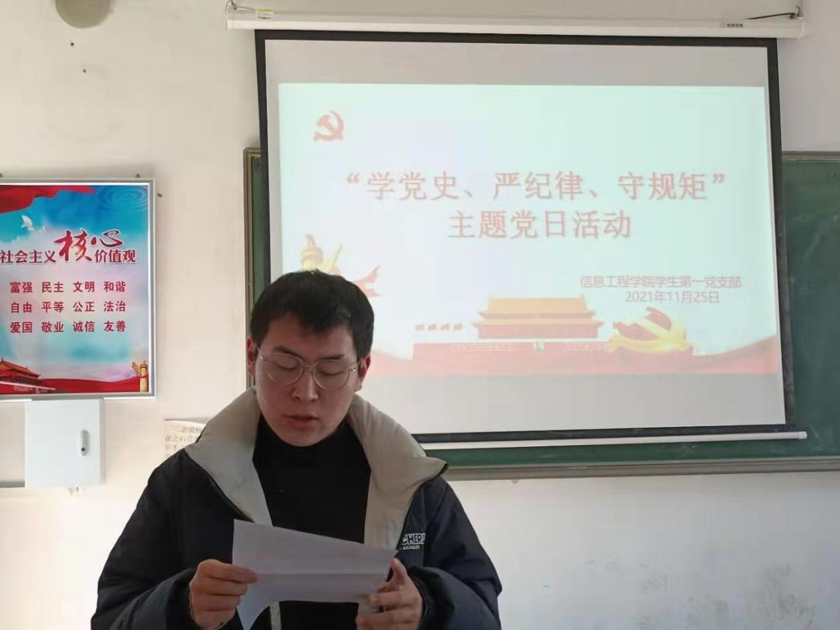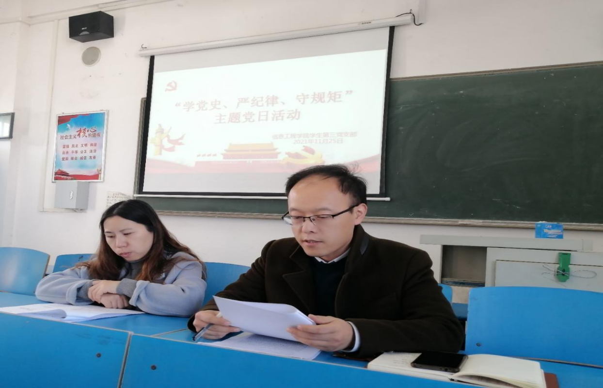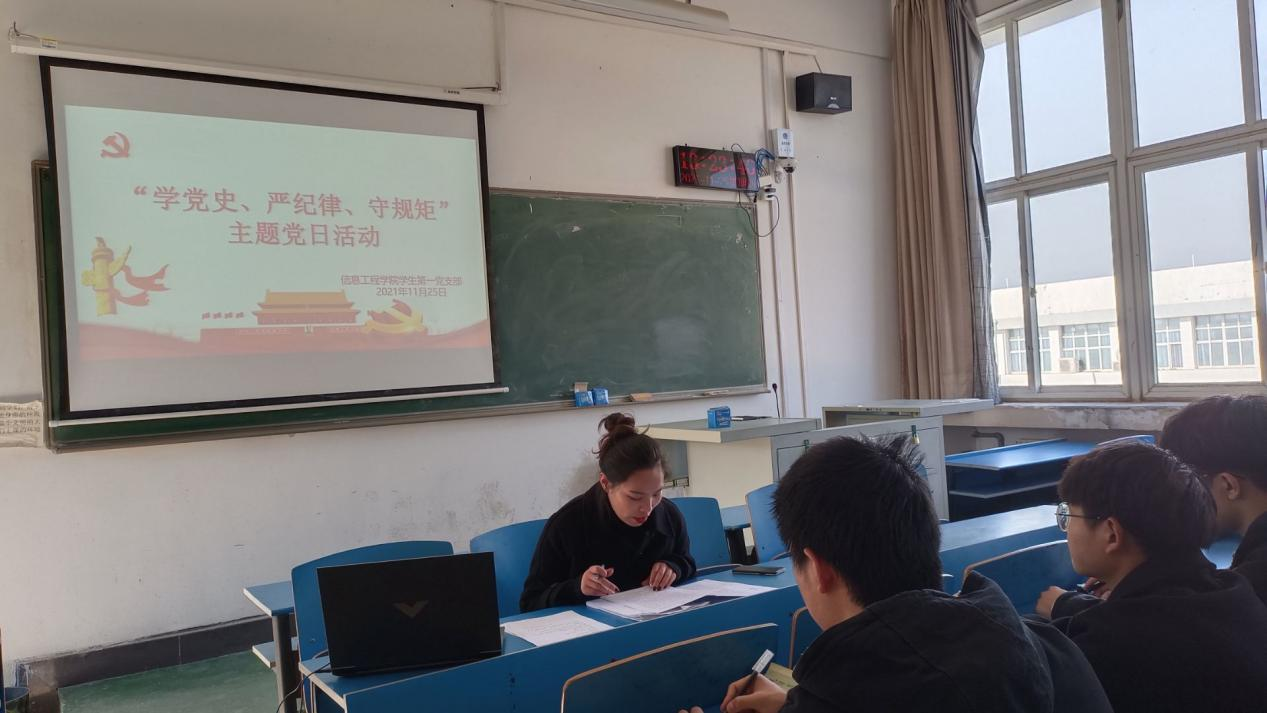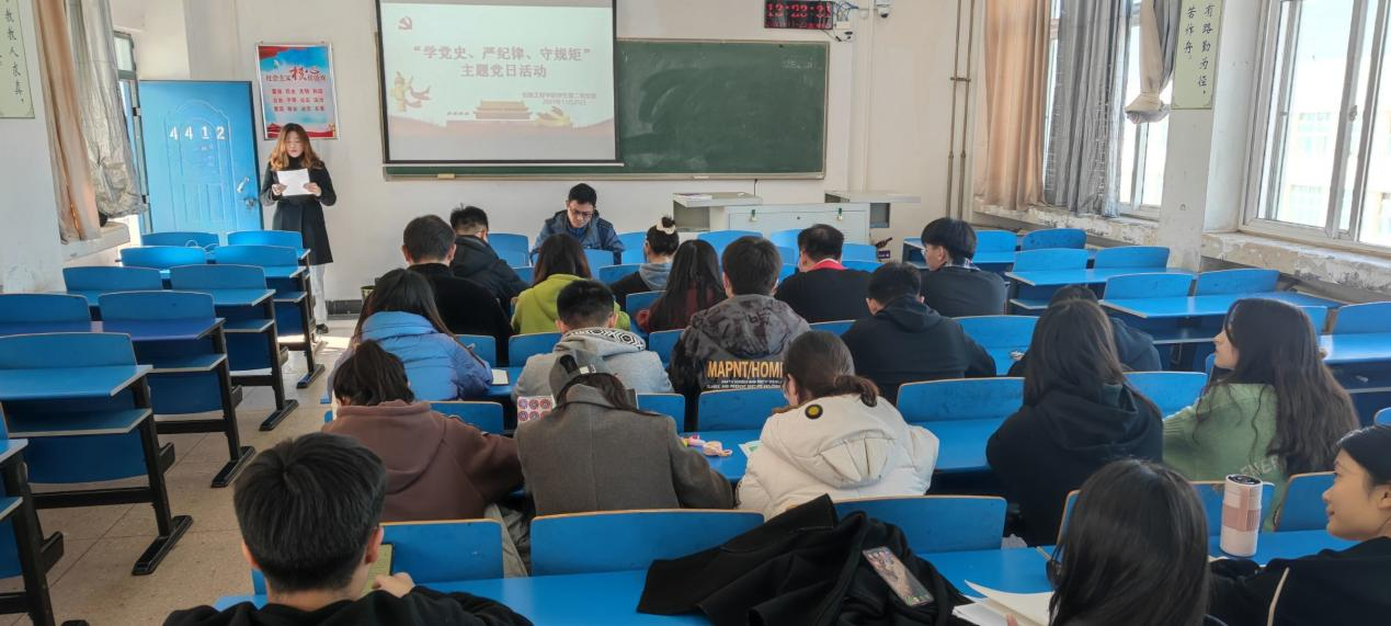 为进一步扎实推进党史学习教育,深入贯彻学习十九届六中全会和河南省第十一次党代会精神,强化学生党员的规矩意识和纪律意识,坚定对党忠诚、为党奉献的信念和决心,williamhill中国学生党支部第一、二、三支部于2021年11月18日下午在4号教学楼开展以“学党史·严纪律·守规矩”为主题的党日活动。williamhill中国学生党支部第一支部书记刘柯老师、第二支部书记崔兵老师、第三支部组织委员宁超魁、宣传委员孙晓延以及全体学生党员、预备党员参加了本次党日活动。