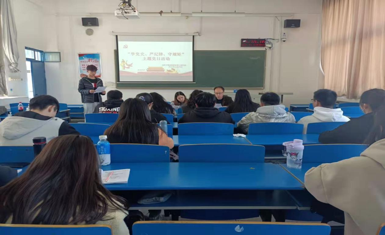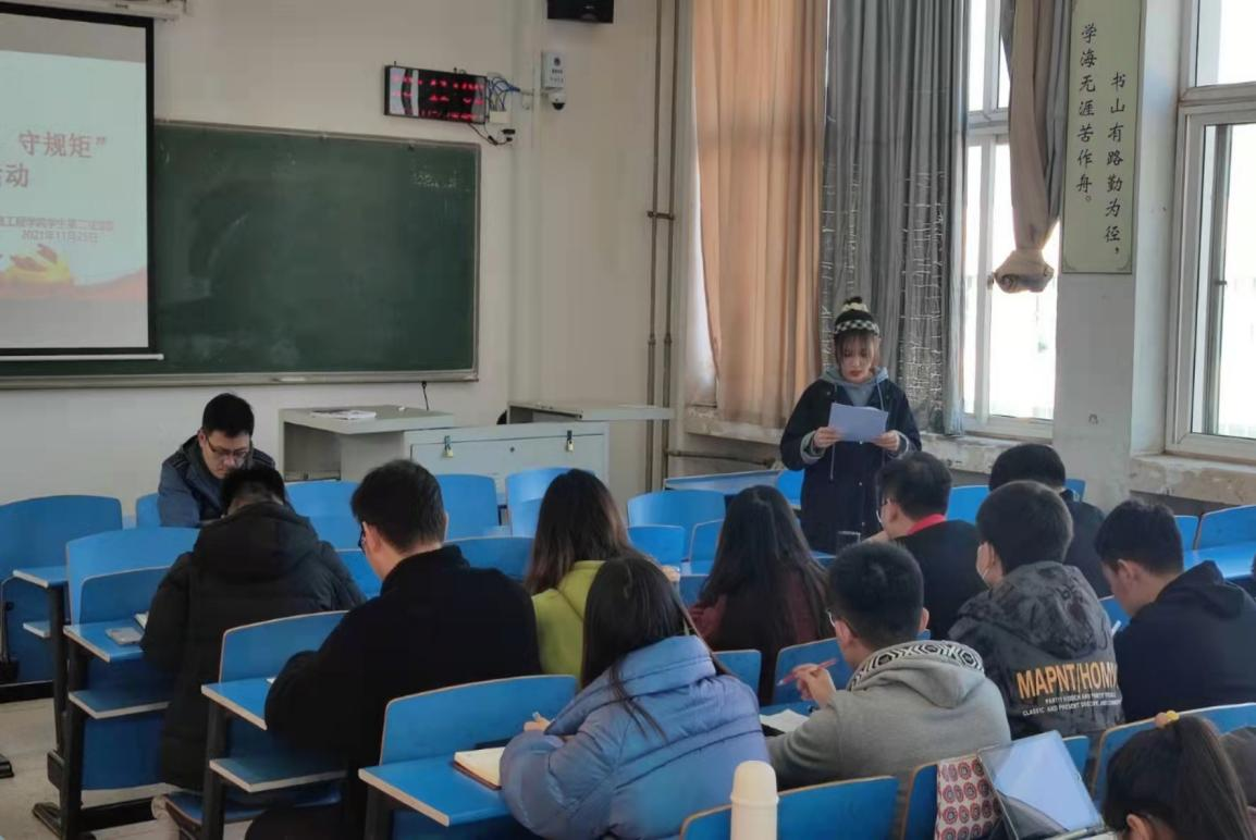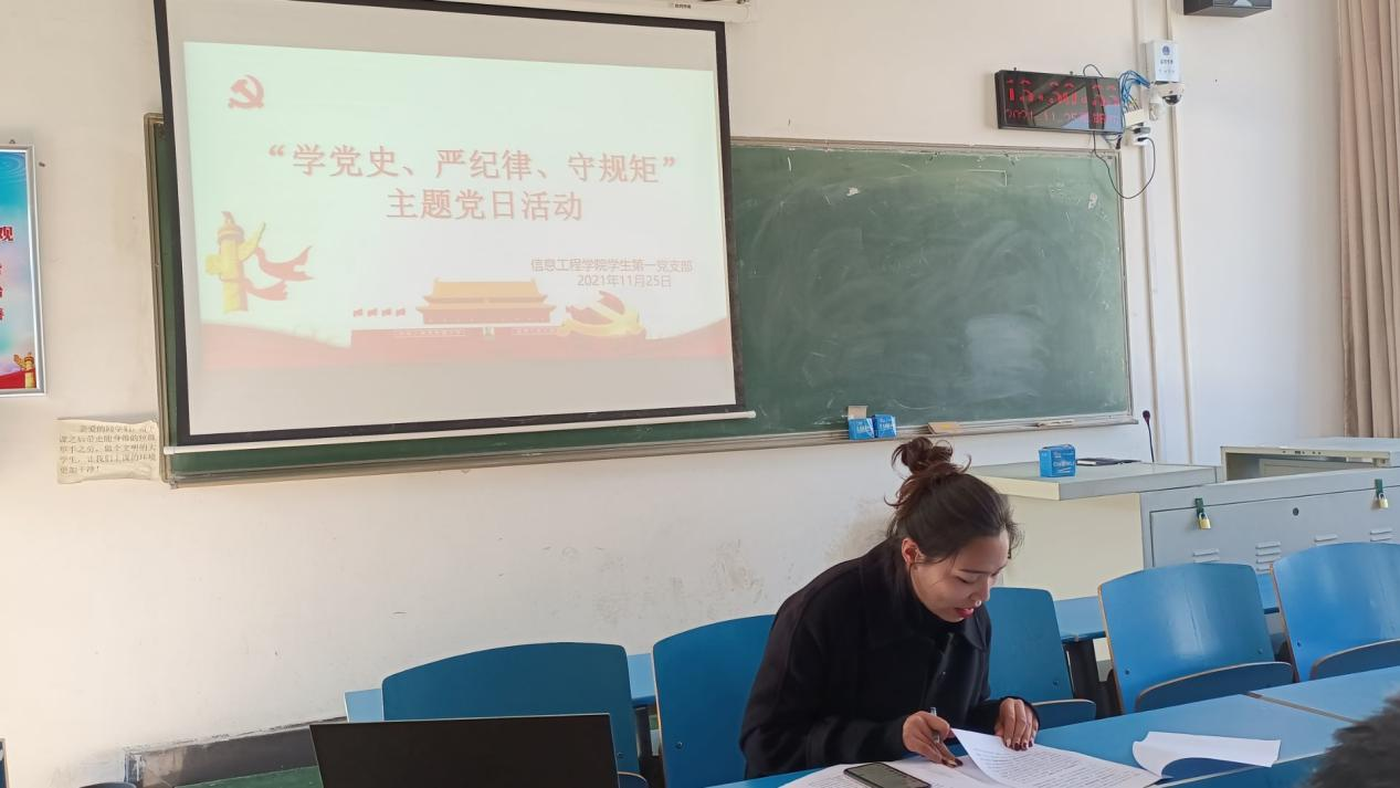 为进一步扎实推进党史学习教育,深入贯彻学习十九届六中全会和河南省第十一次党代会精神,强化学生党员的规矩意识和纪律意识,坚定对党忠诚、为党奉献的信念和决心,williamhill中国学生党支部第一、二、三支部于2021年11月18日下午在4号教学楼开展以“学党史·严纪律·守规矩”为主题的党日活动。williamhill中国学生党支部第一支部书记刘柯老师、第二支部书记崔兵老师、第三支部组织委员宁超魁、宣传委员孙晓延以及全体学生党员、预备党员参加了本次党日活动。