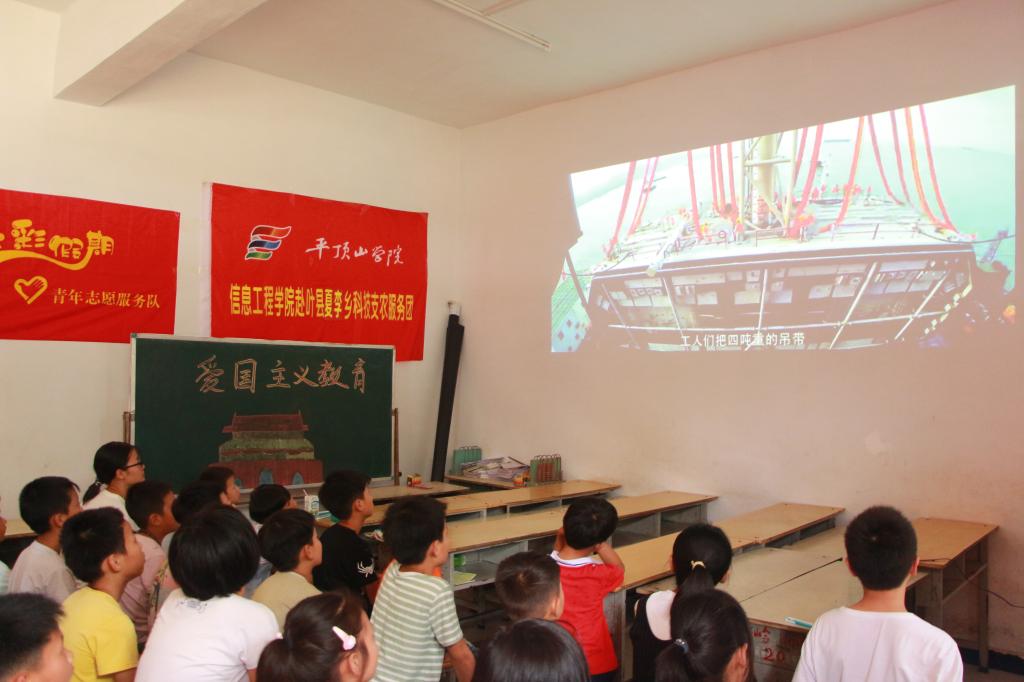 活动伊始,小朋友与志愿者们在教室准备爱国教育课程,许岭村驻村第一团支部书记李永恒也前来观看。志愿者引导孩子们全体起立,演唱国歌,伴随着孩子们的歌声,活动正式开始。支教组的志愿者为孩子们播放爱国主义宣传片——《祖国妈妈我爱你》。影片结束,志愿者们对孩子们进行提问:“习近平爷爷对小学生有什么寄托?”孩子们踊跃发言,现场氛围热烈,赵嘉亮小朋友说:“习爷爷希望我们好好学习、天天向上、认真上课”,简单的话语,传递出孩子们浓浓的真情。紧接着,志愿者提到:“五星红旗上的大星代表什么?‘四颗小星绕着大星’又有什么含义?”;张文树小朋友认真的说道:“大星就是中国共产党,小星是亿万人民,小星绕大星就是五十六个名族相互团结、围绕着中国共产党”,张文树小朋友的回答赢得的在座志愿者和小朋友们的掌声。随后,志愿者们为小孩子们播放《厉害了,我的国》这一爱国主义短片,并拿出书李书记代表共青团中央倡导的关爱留守儿童活动“七彩假期”志愿服务项目中的拼图,希望通过拼图活动,让孩子们更加了解中国的领土分布,认识到中国领土不可分割。志愿者们让孩子们发挥想象力,画出他们心中关于爱国的东西,表达自己对祖国的热爱。其中张文树小朋友画的天安门图画最认真,淡黄色彩笔摹画出的天安门轮廓、三朵淡蓝色的云彩、鲜红色的红旗、金黄色彩色勾勒的五颗星星以及褐色的英雄人民纪念碑,这样一幅宏大而鲜明的图画、这样一幅孩子心中铭记的天安门,正是孩子对祖国的无限热爱。除此之外,对于今天听课认真的陈新亮、王依霖、许笑含等十位小朋友,志愿者们将其选为今日之星、进行鼓励表扬。
