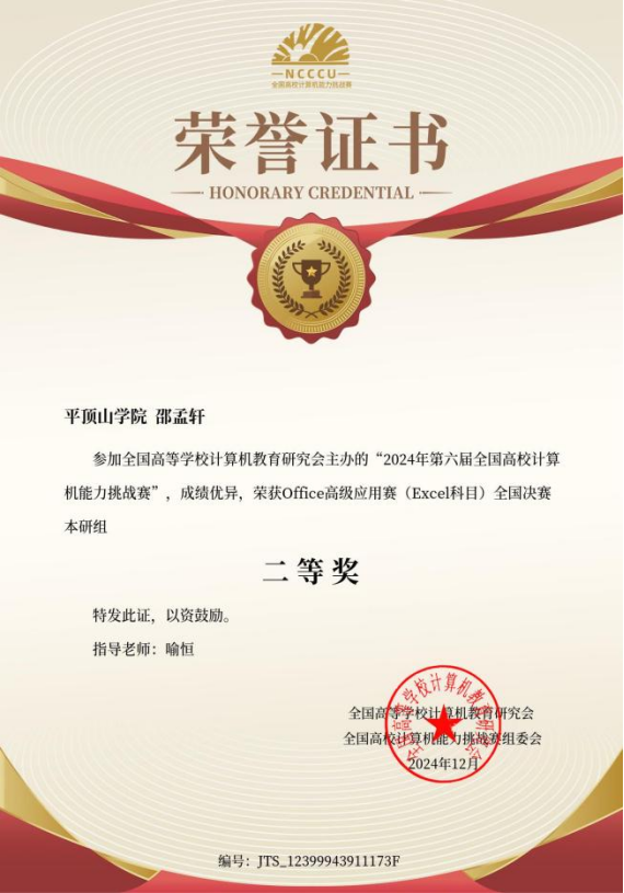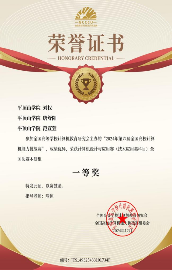 2024年12月29日,第六届全国高校计算机能力挑战赛圆满落幕,在全国赛中Williamhill威廉希尔师生团队最终斩获本研组国家级一等奖两项、二等奖两项、三等奖三项。在华中赛区获奖39项,其中华中赛区奖项一等奖三项、二等奖10项、三等奖26项。其中williamhill中国学生一路披荆斩棘,省赛中突围后在12月全国总决赛中,2022级本科生刘权、唐舒阳在本研组获得计算机设计与应用赛道(技术应用类)全国一等奖(一等奖第一名),并获得比赛奖金,指导教师喻恒。2022级本科生郭来鑫在本研组获得Office高级应用赛(word类)获得全国一等奖,指导教师何丹丹。2022级本科生邵孟轩在本研组获得Office高级应用赛(Excel类)赛道获得全国二等奖,指导教师喻恒。2022级本科生崔梦凡本研组获得程序设计挑战赛(Python类)获得全国二等奖,指导教师徐鹏飞。