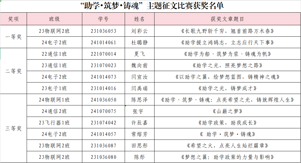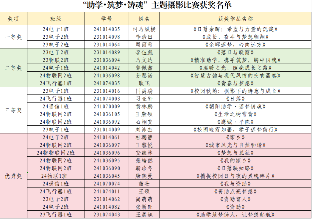 经过细致而公正的评选,“助学·筑梦·铸魂”主题征文比赛最终共选出一等奖2名、二等奖4名、三等奖6名。主题摄影比赛共选出一等奖作品3份、二等奖作品5份、三等奖作品6份、优秀奖作品11份。