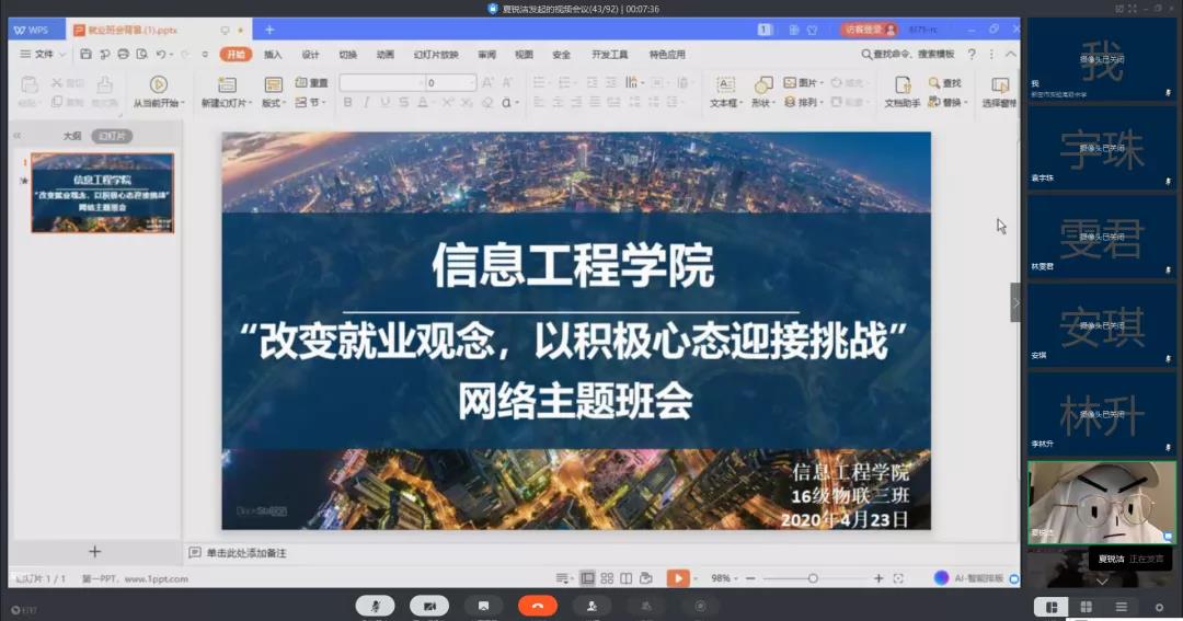 4月24日至30日,williamhill中国举办了以“改变就业观念,以积极心态迎接挑战”为主题的2020届毕业生就业主题班会。此次班会以班级为单位,借助钉钉网络平台开展。参与本次主题班会的有毕业班辅导员、学业导师和各班全体学生。