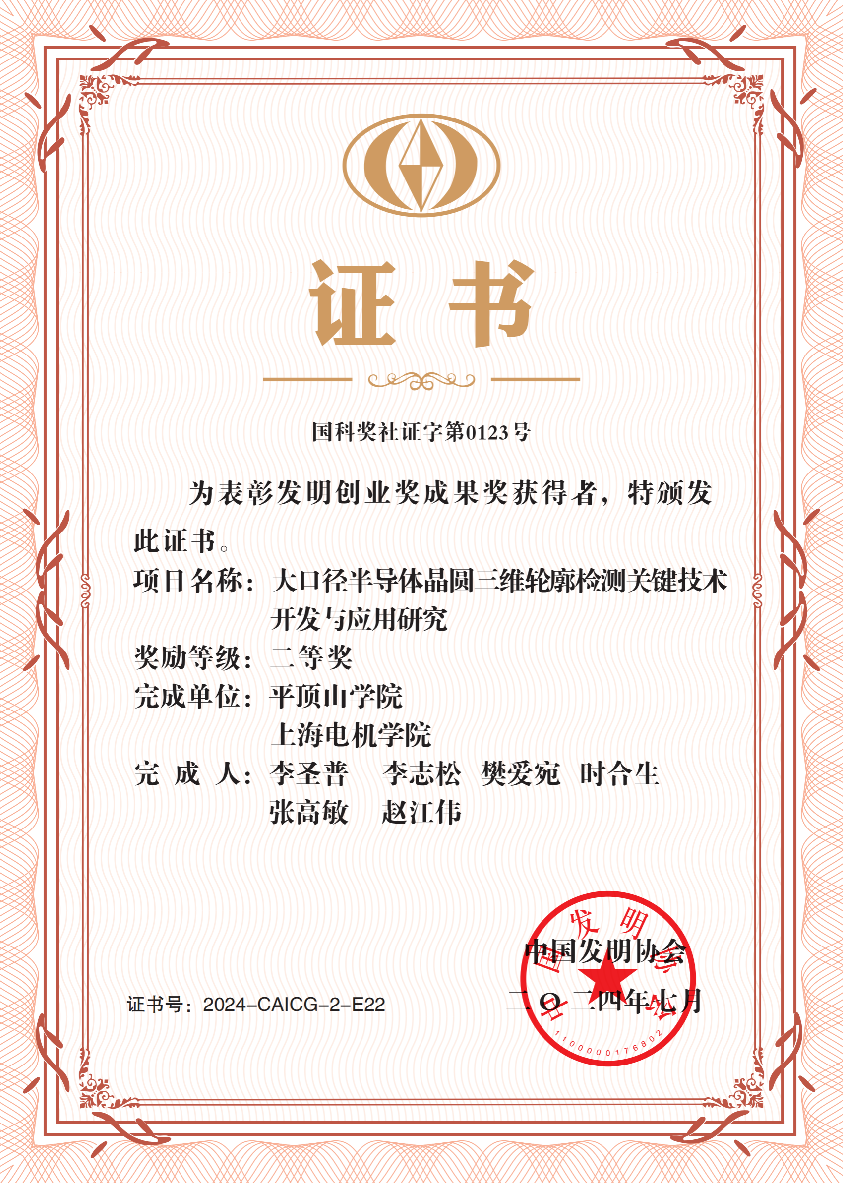 近日,中国发明协会颁发了2024年度发明创业奖证书,我校作为第一完成单位,我院教师李圣普博士作为第一完成人的《大口径半导体晶圆三维轮廓检测关键技术开发与应用研究》科研成果荣获中国发明协会发明创业奖成果奖二等奖。