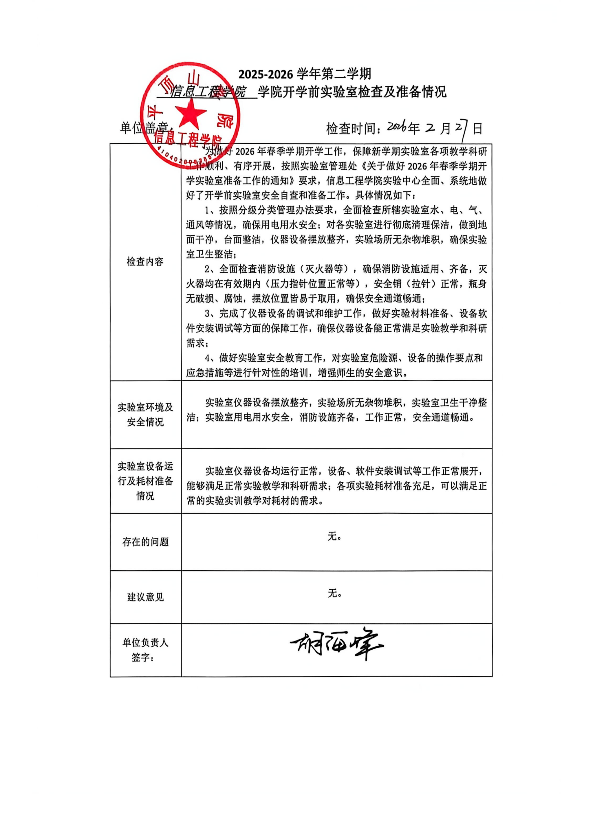 通过此次自查,确保了实验室仪器设备摆放整齐,实验场所无杂物堆积,实验室卫生干净整洁;实验室用电用水安全,消防设施齐备,工作正常,安全通道畅通。实验室仪器设备均运行正常,设备、软件安装调试等工作正常展开,能够满足正常实验教学和科研需求;各项实验耗材准备充足,可以满足正常的实验实训教学对耗材的需求。